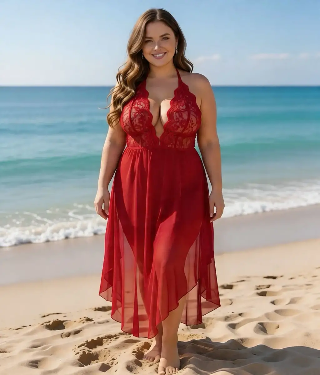 Büyük Beden Dantel Detaylı Dekolteli Fantezi Transparan Gecelik