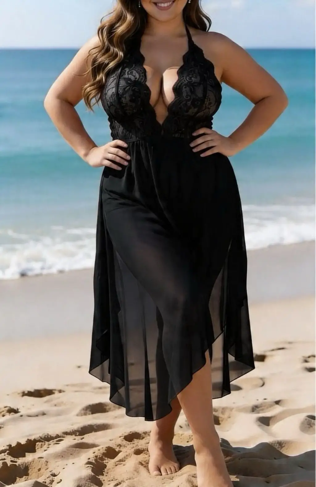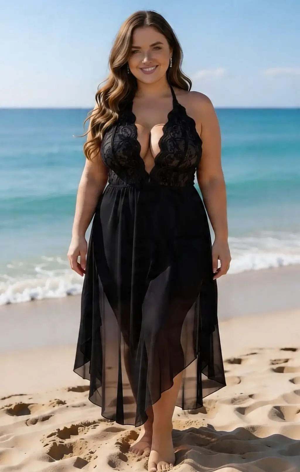 Büyük Beden Dantel Detaylı Dekolteli Fantezi Transparan Gecelik